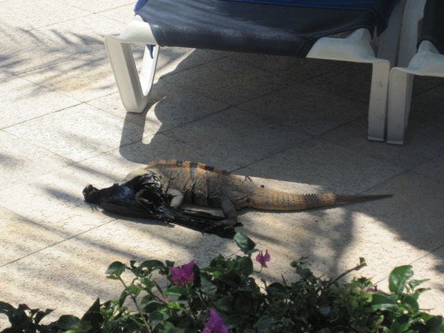 This is interesting question. When I was making a shot of iguana you can see on first picture I had no idea this creatures could be so aggressive and bloodthirsty. The poor bird on second picture probably didn't consider to be part of iguana's diet that day. Most people are also thinking that what iguanas can eat are bananas, small insects, eggs etc. But this what apparently happened - what iguanas can eat is sometime bigger and unlike an insect or an egg.
